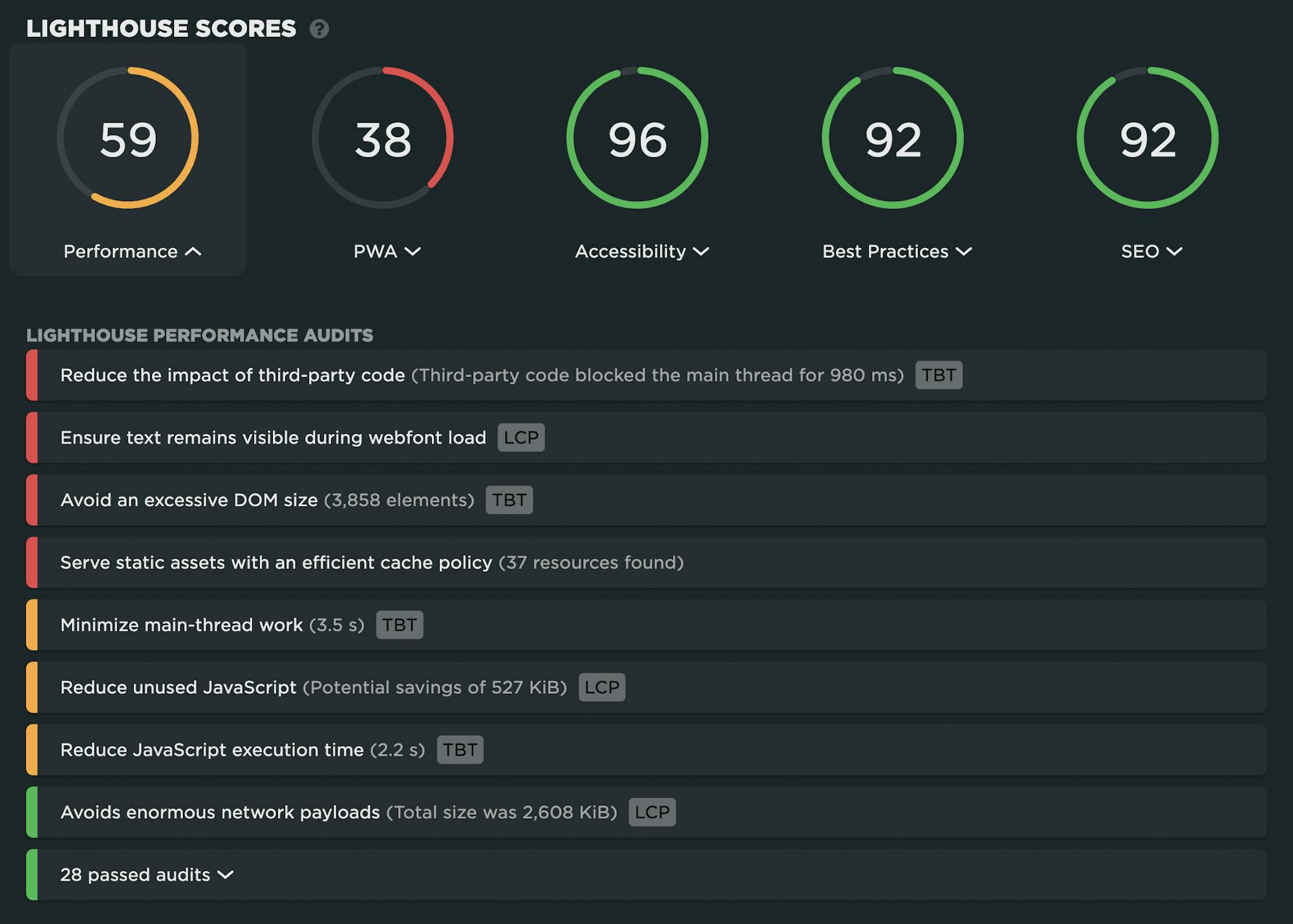 如今,一个典型的网页可能包含数十个第三方脚本。所有这些你无法控制的额外代码可以显著影响你的页面速度。一个单一的非性能阻塞脚本可以完全阻止你的页面渲染。好消息是,只有20个网站中有4个没有通过这项审核(尽管这个数字仍然太高)。